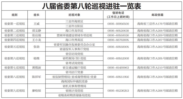 按照省委關于巡視工作統一部署,截至8月11日,八屆省委第八輪巡視完成進駐工作。9個省委巡視組將對??谑行阌^、龍華區,三亞市海棠區、吉陽區,省委軍民融合發展委員會辦公室、省機關事務管理局、省司法廳黨委、省交通運輸廳黨組、省退役軍人事務廳黨組、省統計局黨組、省信訪局黨組、省糧食和物資儲備局黨組、省監獄管理局(戒毒管理局)黨委、省檔案局黨組、省考試局黨組、海南國際仲裁院黨委等16家黨組織開展常規巡視,并對??谑行阌^、龍華區,三亞市海棠區、吉陽區等4個區各2個行政村黨組織開展提級巡視。首次對營商環境建設領域開展專項巡視。