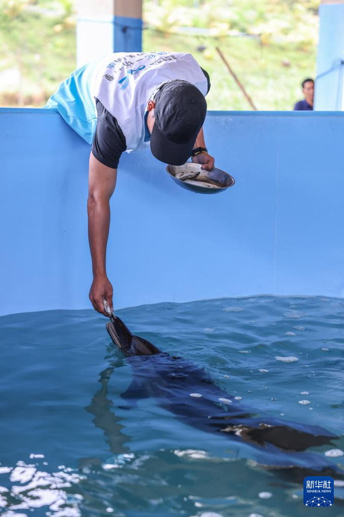 9月14日,在位于海南陵水的救助中心,救助人員給海豚“萬萬”喂食。新華社記者 張麗蕓 攝