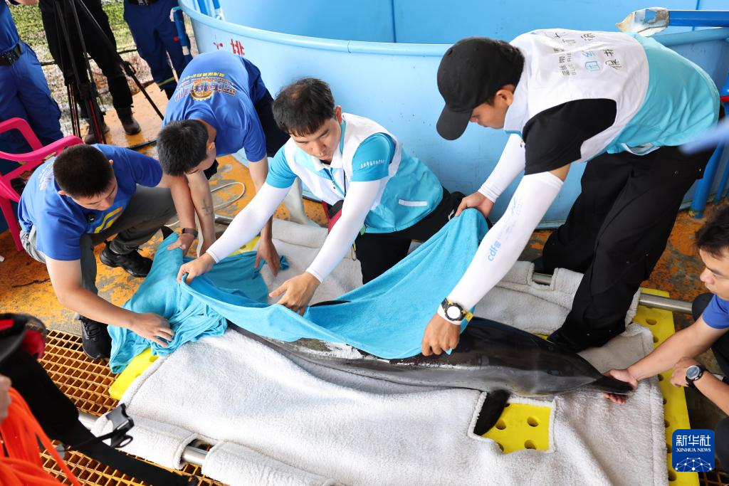 9月14日,在位于海南陵水的救助中心,救助人員將濕毛巾蓋在海豚“萬萬”身上保濕。新華社記者 張麗蕓 攝