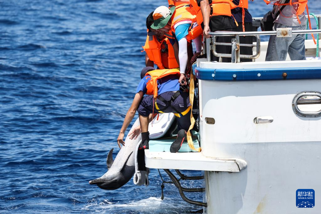 9月14日,在海南萬寧一處海域,救助人員準備放歸海豚“萬萬”。新華社記者 張麗蕓 攝