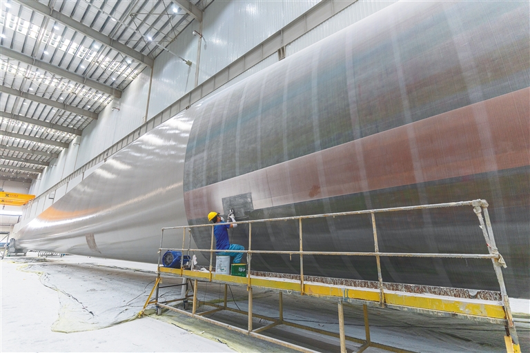 “現在看到的就是‘海上大風車’的巨型葉片,目前我們已實現批量化生產。其中,由明陽智慧能源集團股份公司(以下簡稱明陽集團)自主研制的MySE292海上超大型葉片長143米,在下線時創造了當時全球葉輪直徑最大紀錄。未來我們將研發更大尺寸葉片,進一步提升清潔能源捕獲效率?!泵麝枛|方基地負責人魏磊向記者介紹。