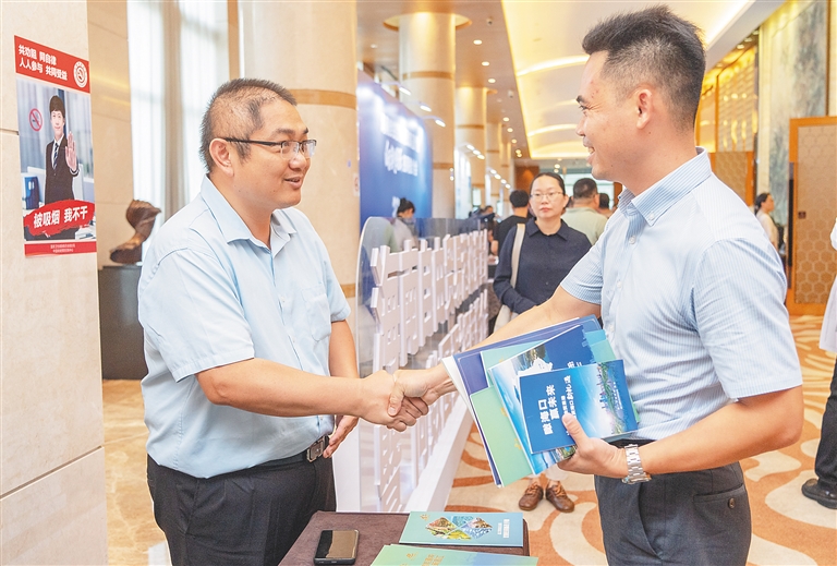 在推介會大廳外的長廊上,一疊疊宣傳手冊,濃縮了海南多個市縣及重點園區的政策介紹,讓現場企業家們快速了解海南。