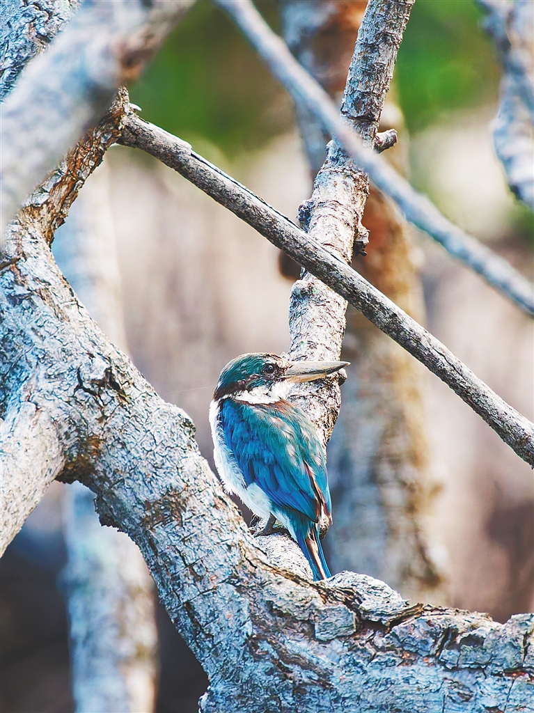 據悉,白領翡翠習性較為孤僻,多單獨活動,常見于沿?;蚪拈_闊生境,如淡水渠道、紅樹林等,偶爾出現于內陸地區。其分布區域主要集中在南亞、東南亞,延伸至印度尼西亞、新幾內亞及澳大利亞北部。任榮霞推測,此次出現在海南的個體可能為“迷鳥”,即在遷徙過程中偏離常規路線,偶然飛抵本地。