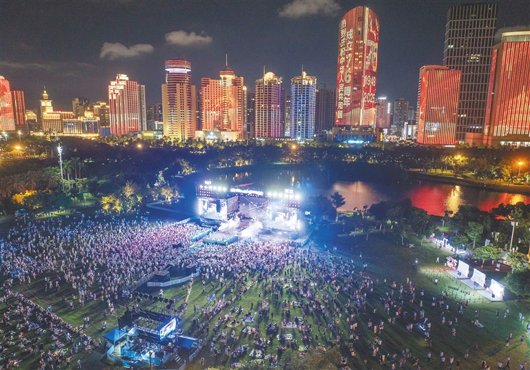 10月1日晚,由??谑新糜魏臀幕瘡V電體育局主辦的“夸下??凇辈萜阂魳窌诤?谌f綠園精彩上演。文/海南日報全媒體記者 習霽鴻 見習記者 劉響 圖/海南日報全媒體記者 李天平