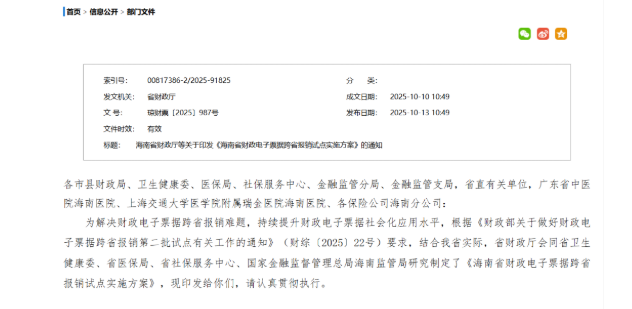 近日,海南省財政廳、海南省衛生健康委員會、海南省醫療保障局、海南省社會保險服務中心、國家金融監督管理總局海南監管局聯合印發《海南省財政電子票據跨省報銷試點實施方案》,以醫療收費電子票據為主要試點,票種重點聚焦醫保零星報銷、商業醫療保險理賠領域,逐步拓展至其他公共服務領域的報銷業務。根據部署計劃于11月底實現財政電子票據跨省報銷應用系統在試點單位上線運行。